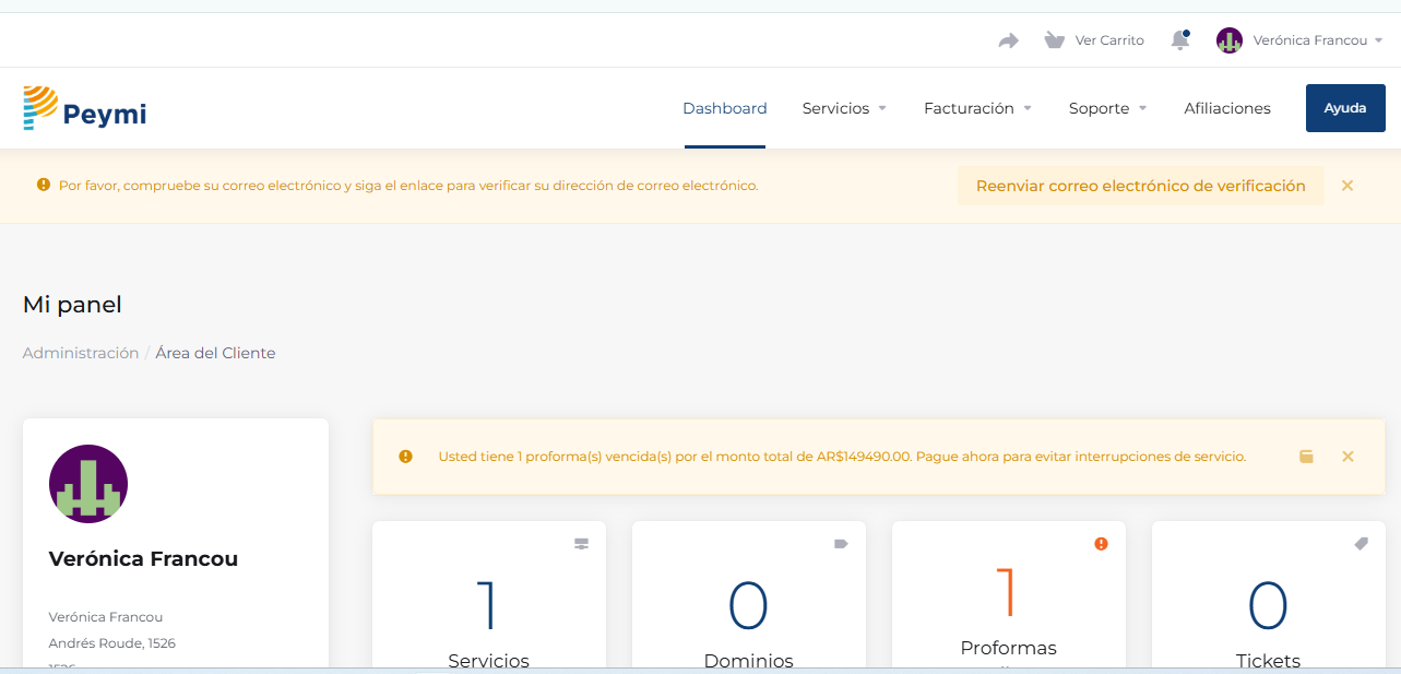 Consultar y descargar proformas (documentos generados por el sistema WHMCS —no son facturas fiscales—).